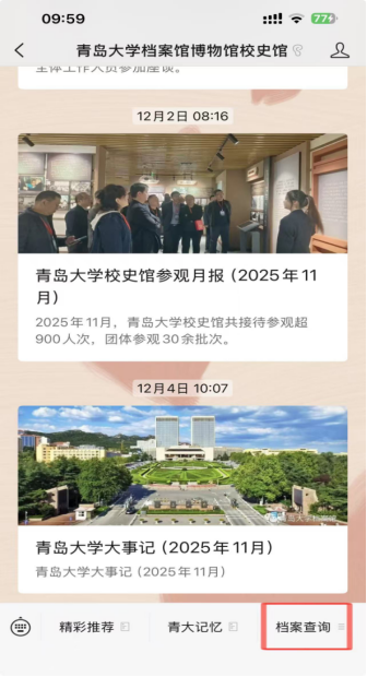 青岛大学档案馆微信公众号界面右下角:档案查询